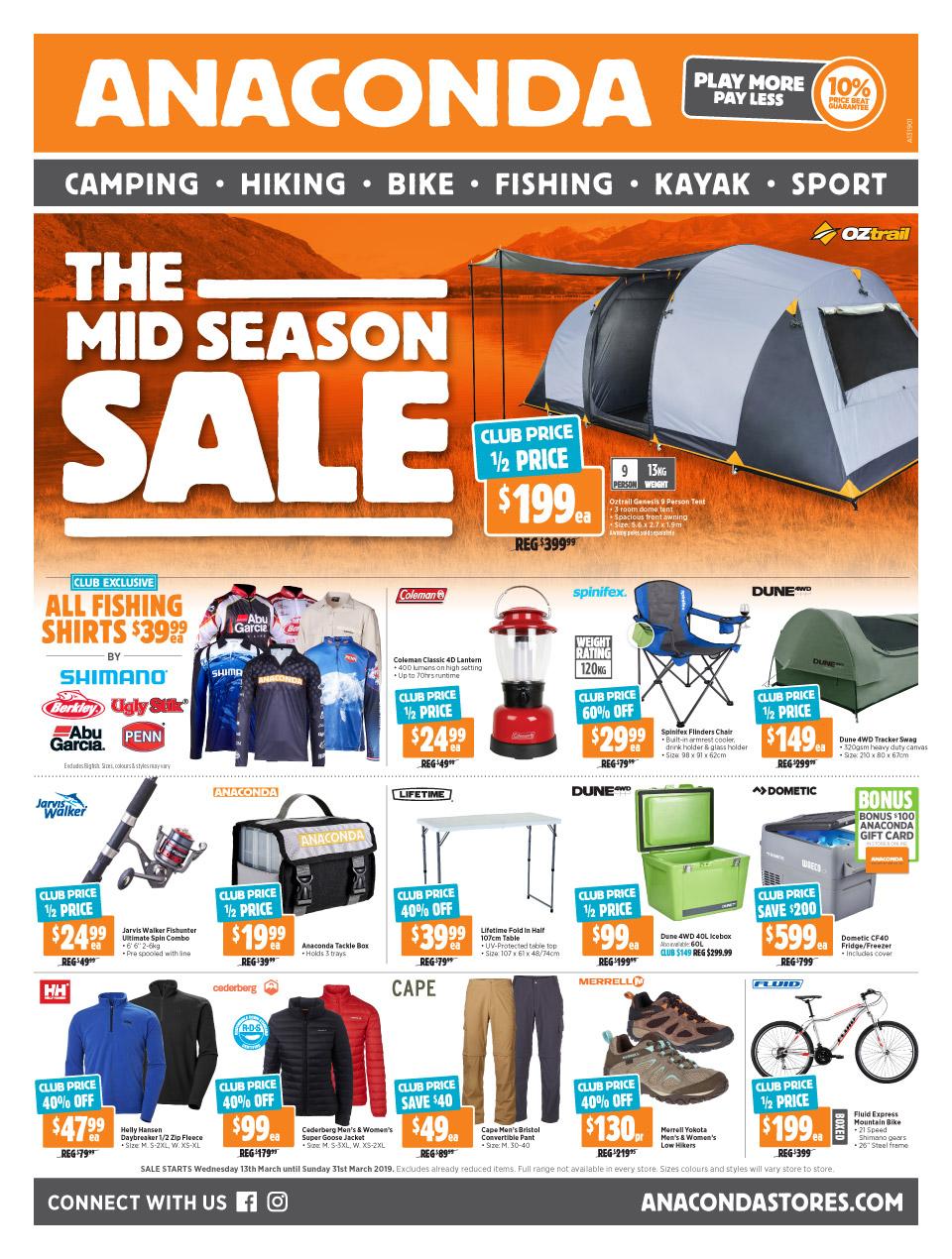Anaconda Catalogue 13 - 31 Mar 2019 13 - 31 Mar 2019 Anaconda Catalogue « 12345678910111213 / 13 » Share & Subscribe Subscribe to Target CataloguesKmart CataloguesBig W CataloguesALDI CataloguesIGA CataloguesColes CataloguesWoolworths CataloguesAll Catalogues (40+) » Other Anaconda Catalogue Anaconda Catalogue EOFY Sale 10 - 26 Jun 2025 Anaconda Catalogue 28 Jan - 14 Feb 2025 Anaconda Catalogue 6 - 27 Jan 2025 Anaconda Catalogue October 20 - November 14, 2024 Hello Summer Anaconda Catalogue September 30 - October 20, 2024 20 Years Of Adventure Sale Other Latest Catalogue ALDI Catalogue 29 Apr - 2 May 2026Amart Catalogue Jan 2025Amcal Catalogue April 8 - 26, 2026 Mega SaleAnaconda Catalogue EOFY Sale 10 - 26 Jun 2025Angus and Coote Catalogue April 12 - May 10, 2026 Mother's Day Gift GuideAustralia Post Catalogue Back to School Jan 2025Australian Butchers Catalogue 7 - 13 Aug 2024Autobarn Catalogue April 14 - May 5, 2026 All For The BargainsBaby Bunting Catalogue May 2024BCF Catalogue April 6 - 27, 2026 ing Holiday Fun Starts HereBest & Less Catalogue Aug 2024Bob Jane Catalogue Jan 2025Cheap As Chips Catalogue December 23, 2025 - January 6, 2026 Boxing Day Door Buster DealsChemist King Catalogue 7 - 21 Aug 2024Chemist Warehouse Catalogue Jan 2025Christmas Aldi Catalogue Big Sale ClearanceColes Catalogue April 24 - May 7, 2026 Best Buys - Better LivingCostco Catalogue 9 Jun - 6 Jul 2025Discount Drug Store Catalogue Feb 2024Early Settler Cataogue EOFY 2024Ezibuy Catalogue Sale Feb 2024Foodland Catalogue 18 - 24 Feb 2026Foodworks Catalogue 11 - 17 Feb 2026Freedom Furniture Catalogue Aug 2024Goldmark Catalogue April 12 - May 10, 2026 Gifts She'll LoveHarris Scarfe Catalogue 24 May - 7 Jun 2025Harvey Norman Catalogue Electrical Personal Care April 23 - 29, 2026Hop into Bunnings Catalogue March 11 - April 5, 2026 Warehouse for the Lowest PricesIGA Catalogue April 21 - 28, 2026 QLD MediumIKEA Catalogue Jun 2024Innovations Catalogue Summer 2024Jaycar Catalogue 7 - 20 Jan 2025JB Hi-Fi Catalogue 22 - 28 May 2025Lenovo Catalogue Jan 2024Liquorland Catalogue 7 - 13 Feb 2024Michael Hill Catalogue Unmissable Sale 2024Mitre 10 Catalogue EOFY 2024Mother's Day Kmart Catalogue April 15 - May 10, 2026 Mum, Sorted Big W Catalogue April 15, 2026 PreviewMyer Catalogue April 19 - May 10, 2026 Mothers Love Turning HeadsNew World Mailer 13 - 19 Apr 2026Officeworks Catalogue March 30 - April 14, 2026 We've Dropped Prices on Hundreds of School Holiday Must-HavesPriceline Catalogue March 31 - May 30, 2026 Health & BeautyProuds Catalogue April 12 - May 10, 2026 Celebrate and SaveRebel Sports Catalogue Jun 2024Repco Catalogue Father\'s Day 2024Sale Fantastic Furniture Catalogue December 18, 2024 - February 3, 2025 Spotlight Catalogue 15 Jan - 4 Feb 2025Stratco Catalogue Jan 2025Supercheap Auto Catalogue December 14 - 21, 2025 Make It A Super ChristmasTarget Catalogue 3 - 27 Apr 2025The Good Guys Catalogue 16 - 22 Jan 2025The Reject Shop Catalogue Jun 2024Total Tools Catalogue Father\'s Day 2024Toyworld Catalogue Toy Sale Oct - Nov 2024Weekly Woolworths Catalogue April 22 - 28, 2026 VICWoolworths Weekly Woolworths Mailer (Countdown) April 19 - 26, 2026 Mid season sale that is viewable on Anaconda Catalogue 13 - 31 Mar 2019. See all the outdoor products, sportswear, camping, and more.