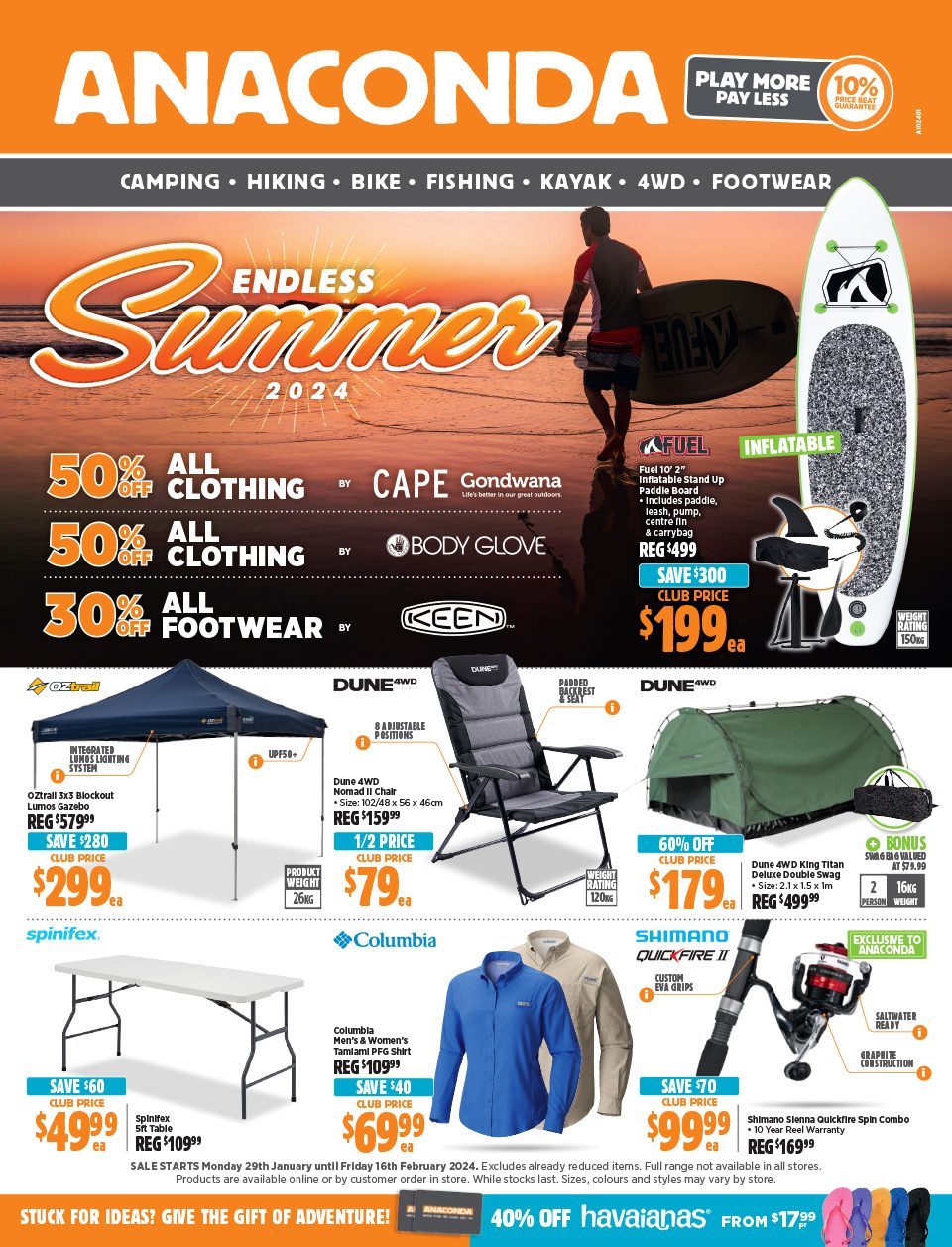 You can save half on clothing and footwear. Buy great brands like Columbia, Shimano, spinifex in Anaconda Catalogue 29 Jan - 24 Feb 2024. Enjoy some of the best deals of camping and outdoor sports.