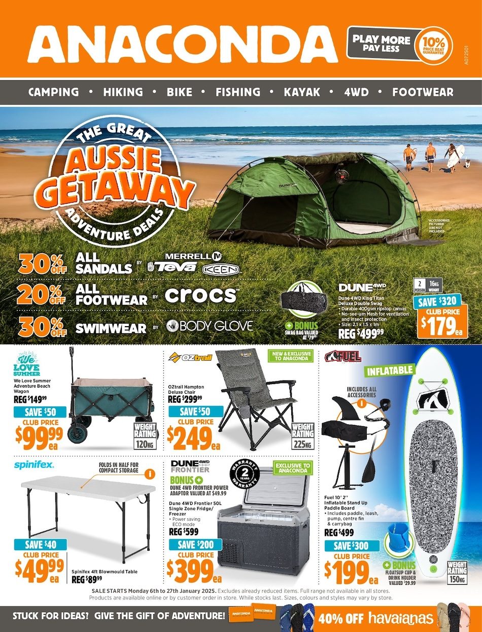 Anaconda Catalogue 6 - 27 Jan 2025 Jan 6, 2025 - Jan 26, 2025 Anaconda Catalogue « 12345678910111213141516171819202122232425262728293031 / 31 » Share & Subscribe Subscribe to Target CataloguesKmart CataloguesBig W CataloguesALDI CataloguesIGA CataloguesColes CataloguesWoolworths CataloguesAll Catalogues (40+) » Other Anaconda Catalogue Anaconda Catalogue EOFY Sale 10 - 26 Jun 2025 Anaconda Catalogue 28 Jan - 14 Feb 2025 Anaconda Catalogue 6 - 27 Jan 2025 Anaconda Catalogue October 20 - November 14, 2024 Hello Summer Anaconda Catalogue September 30 - October 20, 2024 20 Years Of Adventure Sale Other Latest Catalogue ALDI Catalogue 8 - 11 Apr 2026Amart Catalogue Jan 2025Amcal Catalogue March 11 - April 5, 2026 Hop into SavingsAnaconda Catalogue EOFY Sale 10 - 26 Jun 2025Angus and Coote Catalogue March 22 - April 12, 2026 Celebrating Love Since 1895Australia Post Catalogue Back to School Jan 2025Australian Butchers Catalogue 7 - 13 Aug 2024Autobarn Catalogue March 24 - April 14, 2026 All For Easter Holiday EssentialsBaby Bunting Catalogue May 2024Best & Less Catalogue Aug 2024Bob Jane Catalogue Jan 2025Cheap As Chips Catalogue December 23, 2025 - January 6, 2026 Boxing Day Door Buster DealsChemist King Catalogue 7 - 21 Aug 2024Chemist Warehouse Catalogue Jan 2025Christmas Aldi Catalogue Big Sale ClearanceColes Catalogue April 1 - 7, 2026 WA PT HEDLANDCostco Catalogue 9 Jun - 6 Jul 2025Discount Drug Store Catalogue Feb 2024Early Settler Cataogue EOFY 2024Ezibuy Catalogue Sale Feb 2024Foodland Catalogue 18 - 24 Feb 2026Foodworks Catalogue 11 - 17 Feb 2026Freedom Furniture Catalogue Aug 2024Goldmark Catalogue February 15 - March 22, 2026 Get the Look for LessHarris Scarfe Catalogue 24 May - 7 Jun 2025Harvey Norman Catalogue Computers Amazing Tech Deals April 1 - 15, 2026Hop into Bunnings Catalogue March 11 - April 5, 2026 Warehouse for the Lowest PricesIGA Catalogue April 1 - 7, 2026 NSW Large V2IKEA Catalogue Jun 2024Innovations Catalogue Summer 2024Jaycar Catalogue 7 - 20 Jan 2025JB Hi-Fi Catalogue 22 - 28 May 2025Lenovo Catalogue Jan 2024Liquorland Catalogue 7 - 13 Feb 2024Low Prices For Life - April School Holidays Kmart Catalogue April 1 - 29, 2026 Make It A BCF Catalogue March 16 - April 6, 2026 ing Fun EasterMichael Hill Catalogue Unmissable Sale 2024Mitre 10 Catalogue EOFY 2024Myer Catalogue March 29 - April 19, 2026 Toy SaleNew World Mailer 30 Mar - 5 Apr 2026Officeworks Catalogue March 30 - April 14, 2026 We've Dropped Prices on Hundreds of School Holiday Must-HavesPriceline Catalogue Week 36-37 2025Prouds Catalogue March 22 - April 12, 2026 Sparkle and SaveRebel Sports Catalogue Jun 2024Repco Catalogue Father\'s Day 2024Sale Fantastic Furniture Catalogue December 18, 2024 - February 3, 2025 School's Out Big W Catalogue April 1, 2026 PreviewSpotlight Catalogue 15 Jan - 4 Feb 2025Stratco Catalogue Jan 2025Supercheap Auto Catalogue December 14 - 21, 2025 Make It A Super ChristmasTarget Catalogue 3 - 27 Apr 2025The Good Guys Catalogue 16 - 22 Jan 2025The Reject Shop Catalogue Jun 2024Total Tools Catalogue Father\'s Day 2024Toyworld Catalogue Toy Sale Oct - Nov 2024Weekly Woolworths Catalogue April 1 - 7, 2026 NSW NorthWoolworths Weekly Woolworths Mailer (Countdown) March 29 - April 12, 2026 Anaconda Catalogue 6 - 27 Jan 2025 with top deals on sandals, swimwear, footwear, and more products. 6 Jan 2025 Editor