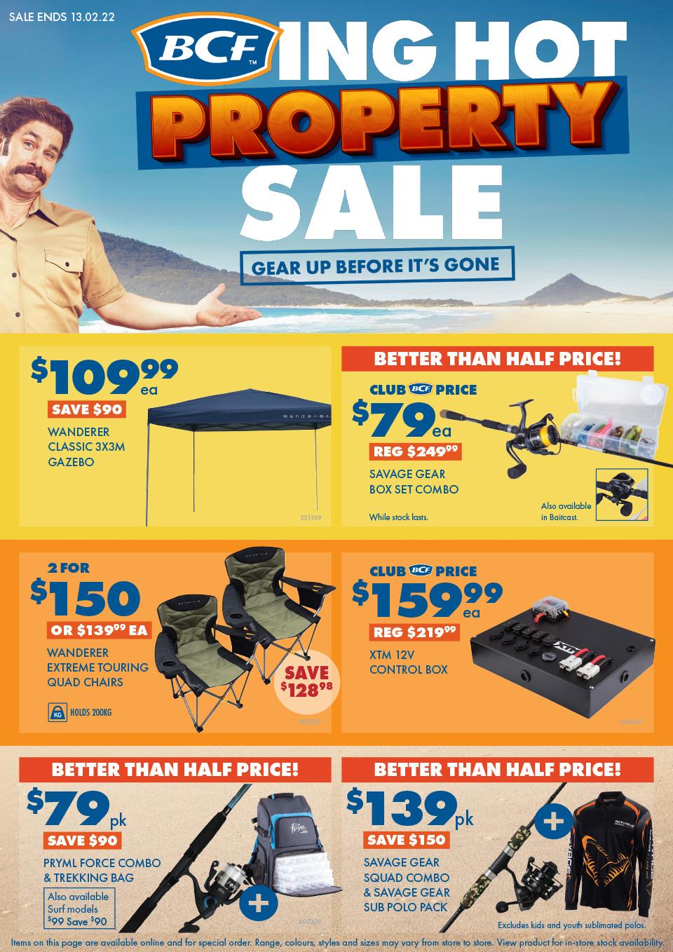 Gear up before the stocks are gone and while these deals are available at BCF stores. The latest BCF Catalogue can guide you to the best prices. Find deals better than half prices on two combos on the front page. They have camp-touring chairs, control box, box set combo, classic gazebo, and more items on the same page of the catalogue. BCF sells essential touring products. When you have these supplies with you, you can travel the entire country with no difficulty, discomfort or surprises. Swags are available at lower costs. Pay $329 for Wanderer contour single swag & wanderer extra wide stretcher on pg 2.