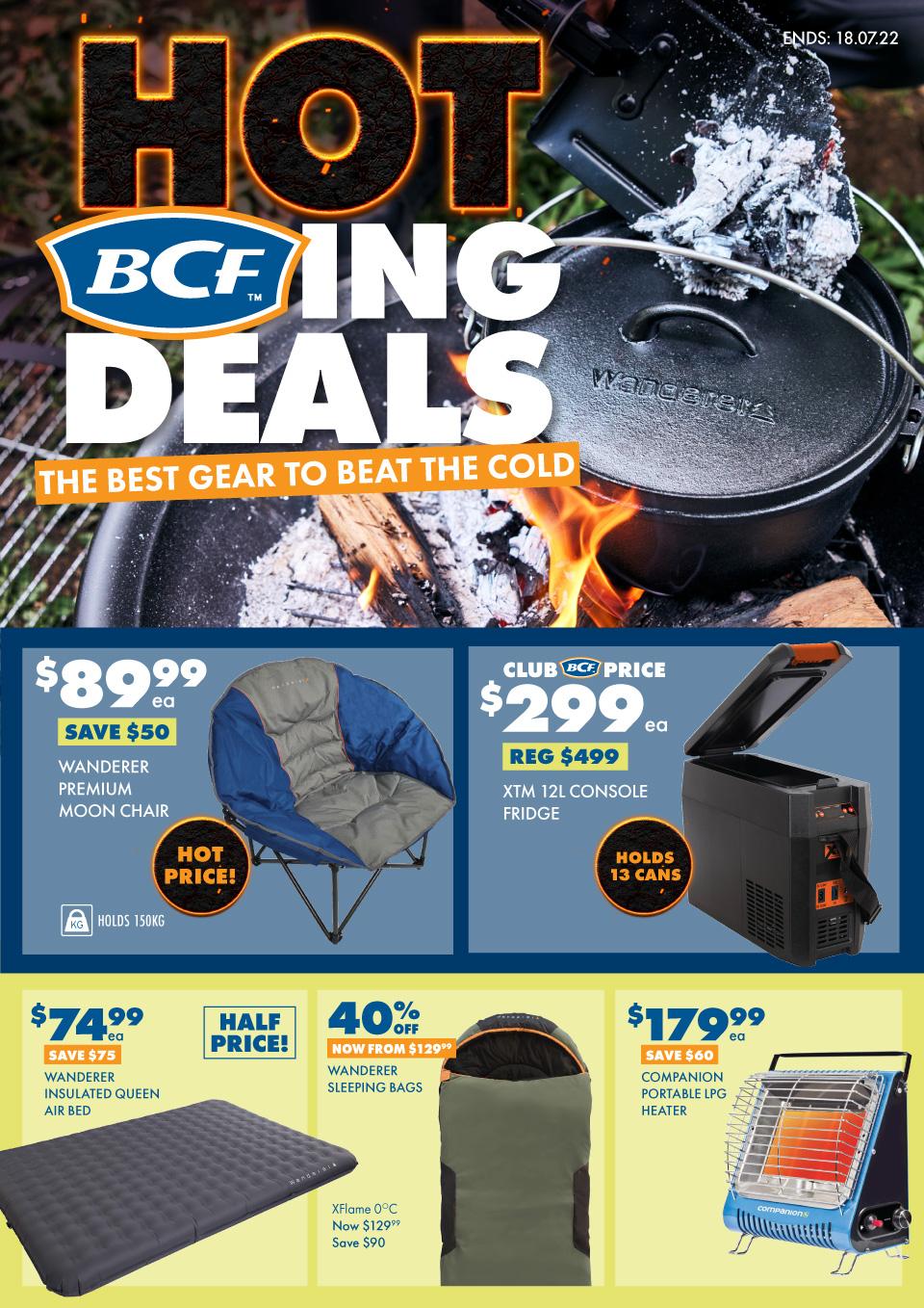 The new BCF Catalogue is now available. Find camping and outdoor sports products in this catalogue. New offers include camp chairs. One of them is Wanderer premium moon chair. Enjoy beautiful Australian nature with these high quality and durable products. All these will be on sale. BCF Catalogue offers half prices, too. For example, go to pg 2 for the half-price deal on Wanderer winterflame quilt that will cost only $74.99. Fire pit with grill, steel fire pit, grill plates, and more are all in this catalogue. Actually, they spared a rather big place for outdoor cooking equipment. Browse all these and more on BCF Catalogue 4 - 18 Jul 2022: