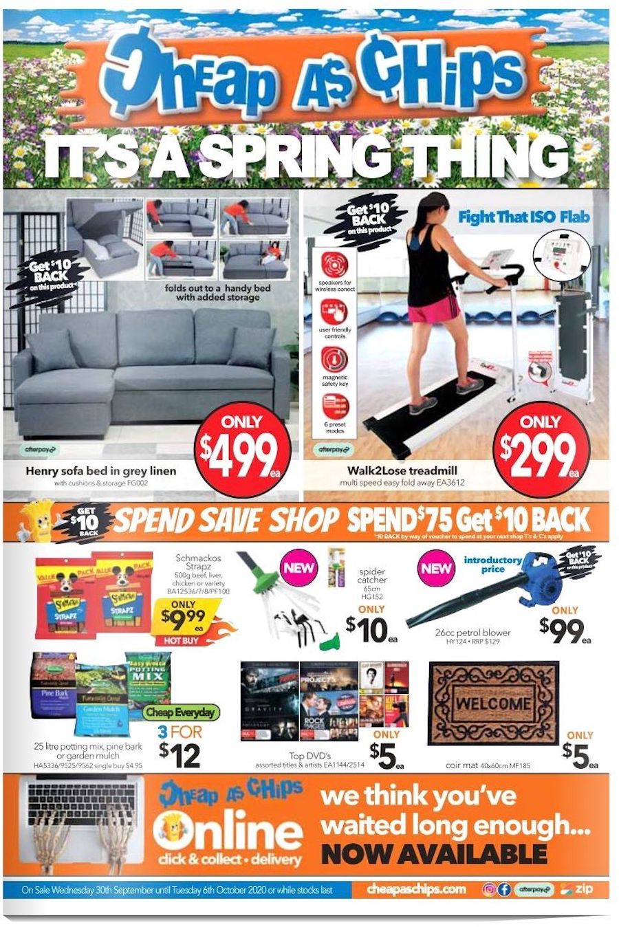 Get $10 back when you spend $75 at Cheap As Chips stores. The new catalogue has the content of deals on DVDs, treadmill, a new sofa which is also a bed, and more for Spring on its cover page. Browse Cheap As Chips Catalogue to discover all of the new deals. Also, it's Spring. That means you may need to take care of your garden. Do the maintenance by yourself with some high-quality tools. Blower Vac, line trimmer, storage boxes, and more items are available in this sale. You can even buy an electric chain saw on the new catalogue. Its price will only be $139.