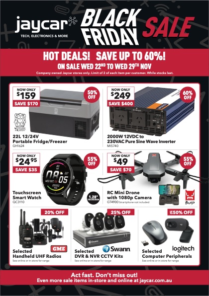 Jaycar Black Friday Catalogue 2023 Nov 22, 2023 - Nov 30, 2023 Jaycar Catalogue « 12345 / 5 » Share & Subscribe Subscribe to Target CataloguesKmart CataloguesBig W CataloguesALDI CataloguesIGA CataloguesColes CataloguesWoolworths CataloguesAll Catalogues (40+) » Other Jaycar Catalogue Jaycar Catalogue 7 - 20 Jan 2025 Jaycar Catalogue Father's Day 2024 Jaycar Catalogue 10 - 21 Jul 2024 Jaycar Catalogue 12 - 30 Jun 2024 Jaycar Catalogue 8 - 19 May 2024 Other Latest Catalogue ALDI Catalogue 8 - 11 Apr 2026Amart Catalogue Jan 2025Amcal Catalogue March 11 - April 5, 2026 Hop into SavingsAnaconda Catalogue EOFY Sale 10 - 26 Jun 2025Angus and Coote Catalogue March 22 - April 12, 2026 Celebrating Love Since 1895Australia Post Catalogue Back to School Jan 2025Australian Butchers Catalogue 7 - 13 Aug 2024Autobarn Catalogue March 24 - April 14, 2026 All For Easter Holiday EssentialsBaby Bunting Catalogue May 2024Best & Less Catalogue Aug 2024Bob Jane Catalogue Jan 2025Cheap As Chips Catalogue December 23, 2025 - January 6, 2026 Boxing Day Door Buster DealsChemist King Catalogue 7 - 21 Aug 2024Chemist Warehouse Catalogue Jan 2025Christmas Aldi Catalogue Big Sale ClearanceColes Catalogue April 1 - 7, 2026 WA PT HEDLANDCostco Catalogue 9 Jun - 6 Jul 2025Discount Drug Store Catalogue Feb 2024Early Settler Cataogue EOFY 2024Ezibuy Catalogue Sale Feb 2024Foodland Catalogue 18 - 24 Feb 2026Foodworks Catalogue 11 - 17 Feb 2026Freedom Furniture Catalogue Aug 2024Goldmark Catalogue February 15 - March 22, 2026 Get the Look for LessHarris Scarfe Catalogue 24 May - 7 Jun 2025Harvey Norman Catalogue Computers Amazing Tech Deals April 1 - 15, 2026Hop into Bunnings Catalogue March 11 - April 5, 2026 Warehouse for the Lowest PricesIGA Catalogue April 1 - 7, 2026 NSW Large V2IKEA Catalogue Jun 2024Innovations Catalogue Summer 2024Jaycar Catalogue 7 - 20 Jan 2025JB Hi-Fi Catalogue 22 - 28 May 2025Lenovo Catalogue Jan 2024Liquorland Catalogue 7 - 13 Feb 2024Low Prices For Life - April School Holidays Kmart Catalogue April 1 - 29, 2026 Make It A BCF Catalogue March 16 - April 6, 2026 ing Fun EasterMichael Hill Catalogue Unmissable Sale 2024Mitre 10 Catalogue EOFY 2024Myer Catalogue March 29 - April 19, 2026 Toy SaleNew World Mailer 30 Mar - 5 Apr 2026Officeworks Catalogue March 30 - April 14, 2026 We've Dropped Prices on Hundreds of School Holiday Must-HavesPriceline Catalogue Week 36-37 2025Prouds Catalogue March 22 - April 12, 2026 Sparkle and SaveRebel Sports Catalogue Jun 2024Repco Catalogue Father\'s Day 2024Sale Fantastic Furniture Catalogue December 18, 2024 - February 3, 2025 School's Out Big W Catalogue April 1, 2026 PreviewSpotlight Catalogue 15 Jan - 4 Feb 2025Stratco Catalogue Jan 2025Supercheap Auto Catalogue December 14 - 21, 2025 Make It A Super ChristmasTarget Catalogue 3 - 27 Apr 2025The Good Guys Catalogue 16 - 22 Jan 2025The Reject Shop Catalogue Jun 2024Total Tools Catalogue Father\'s Day 2024Toyworld Catalogue Toy Sale Oct - Nov 2024Weekly Woolworths Catalogue April 1 - 7, 2026 NSW NorthWoolworths Weekly Woolworths Mailer (Countdown) March 29 - April 12, 2026 Jaycar Black Friday Catalogue 2023 with the fridge/freezer deals, drones, UHF Radios, computer peripherals, CCTV kits, and many more. 22 Nov 2023 Editor