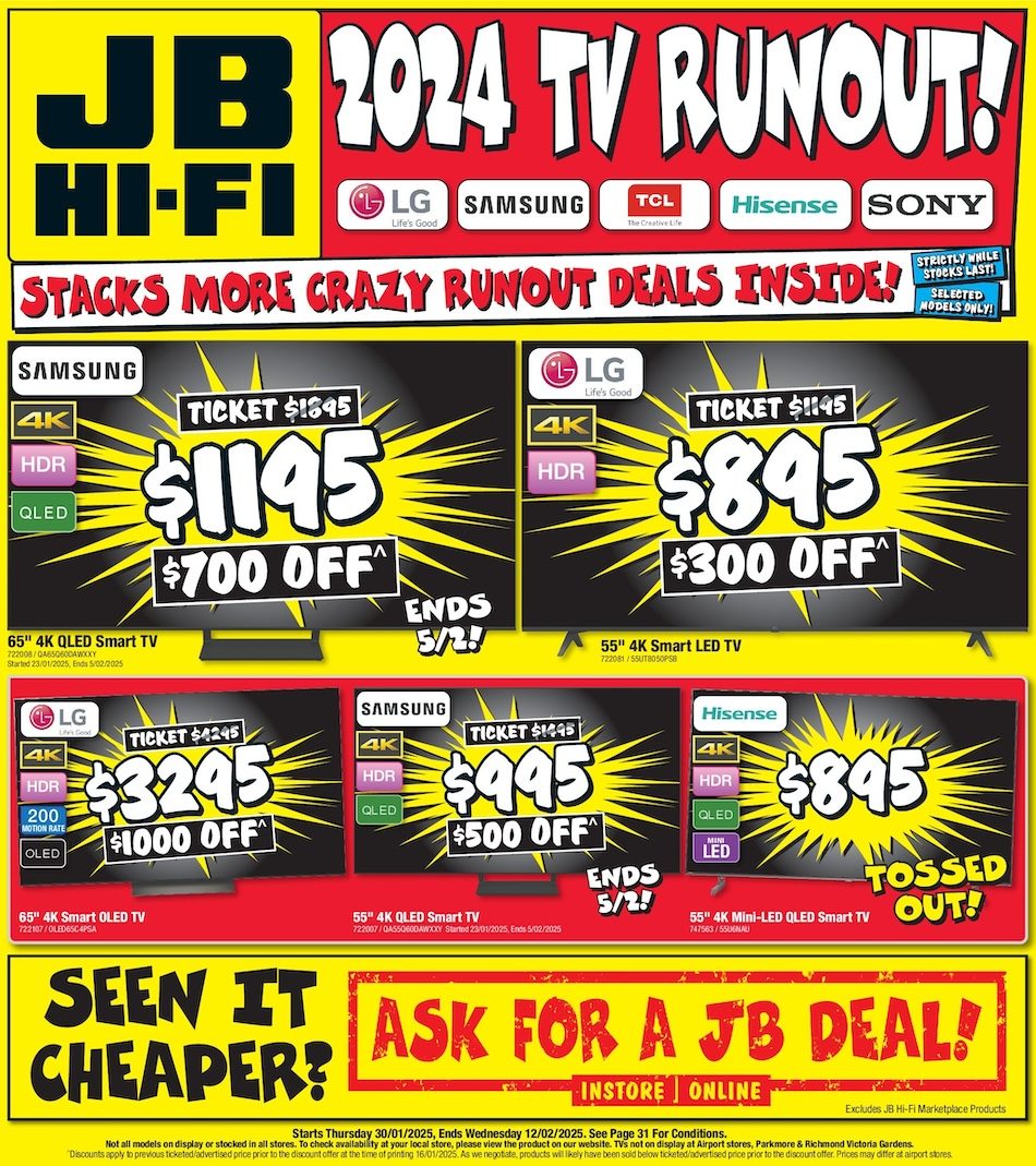 JB Hi-Fi Catalogue 30 Jan - 12 Feb 2025 Jan 30, 2025 - Feb 13, 2025 JB Hi-Fi Catalogue « 123456789101112131415161718192021222324252627282930313233 / 33 » Share & Subscribe Subscribe to Target CataloguesKmart CataloguesBig W CataloguesALDI CataloguesIGA CataloguesColes CataloguesWoolworths CataloguesAll Catalogues (40+) » Other JB Hi-Fi Catalogue JB Hi-Fi Catalogue 22 - 28 May 2025 JB Hi-Fi Catalogue 30 Jan - 12 Feb 2025 JB Hi-Fi Catalogue Big Brand 16 - 29 jan 2025 JB Hi-Fi Catalogue 16 - 29 Jan 2025 JB Hi-Fi Catalogue LG Jan 2025 Other Latest Catalogue ALDI Catalogue 15 - 18 Apr 2026Amart Catalogue Jan 2025Amcal Catalogue March 11 - April 5, 2026 Hop into SavingsAnaconda Catalogue EOFY Sale 10 - 26 Jun 2025Angus and Coote Catalogue March 22 - April 12, 2026 Celebrating Love Since 1895Australia Post Catalogue Back to School Jan 2025Australian Butchers Catalogue 7 - 13 Aug 2024Autobarn Catalogue March 24 - April 14, 2026 All For Easter Holiday EssentialsBaby Bunting Catalogue May 2024BCF Catalogue April 6 - 27, 2026 ing Holiday Fun Starts HereBest & Less Catalogue Aug 2024Bob Jane Catalogue Jan 2025Cheap As Chips Catalogue December 23, 2025 - January 6, 2026 Boxing Day Door Buster DealsChemist King Catalogue 7 - 21 Aug 2024Chemist Warehouse Catalogue Jan 2025Christmas Aldi Catalogue Big Sale ClearanceColes Catalogue April 10 - 23, 2026 Best Buys - Kitchen GadgetsCostco Catalogue 9 Jun - 6 Jul 2025Discount Drug Store Catalogue Feb 2024Early Settler Cataogue EOFY 2024Ezibuy Catalogue Sale Feb 2024Foodland Catalogue 18 - 24 Feb 2026Foodworks Catalogue 11 - 17 Feb 2026Freedom Furniture Catalogue Aug 2024Goldmark Catalogue February 15 - March 22, 2026 Get the Look for LessHarris Scarfe Catalogue 24 May - 7 Jun 2025Harvey Norman Catalogue HN April Flooring Digital April 9 - 27, 2026Hop into Bunnings Catalogue March 11 - April 5, 2026 Warehouse for the Lowest PricesIGA Catalogue April 8 - 14, 2026 NSW Medium V1IKEA Catalogue Jun 2024Innovations Catalogue Summer 2024Jaycar Catalogue 7 - 20 Jan 2025JB Hi-Fi Catalogue 22 - 28 May 2025Lenovo Catalogue Jan 2024Liquorland Catalogue 7 - 13 Feb 2024Low Prices For Life - April School Holidays Kmart Catalogue April 1 - 29, 2026 Michael Hill Catalogue Unmissable Sale 2024Mitre 10 Catalogue EOFY 2024Myer Catalogue April 7 - 19, 2026 Winter Home SaleNew World Mailer 6 - 12 Apr 2026Officeworks Catalogue March 30 - April 14, 2026 We've Dropped Prices on Hundreds of School Holiday Must-HavesPriceline Catalogue Week 36-37 2025Prouds Catalogue March 22 - April 12, 2026 Sparkle and SaveRebel Sports Catalogue Jun 2024Repco Catalogue Father\'s Day 2024Sale Fantastic Furniture Catalogue December 18, 2024 - February 3, 2025 School's Out Big W Catalogue April 1, 2026 PreviewSpotlight Catalogue 15 Jan - 4 Feb 2025Stratco Catalogue Jan 2025Supercheap Auto Catalogue December 14 - 21, 2025 Make It A Super ChristmasTarget Catalogue 3 - 27 Apr 2025The Good Guys Catalogue 16 - 22 Jan 2025The Reject Shop Catalogue Jun 2024Total Tools Catalogue Father\'s Day 2024Toyworld Catalogue Toy Sale Oct - Nov 2024Weekly Woolworths Catalogue April 7 - 14, 2026 QLDWoolworths Weekly Woolworths Mailer (Countdown) March 29 - April 12, 2026 JB Hi-Fi Catalogue 30 Jan - 12 Feb 2025 promoting the new TV sale, mini projectors, notebooks, tablet PCs, phones, and more. 30 Jan 2025 Editor
