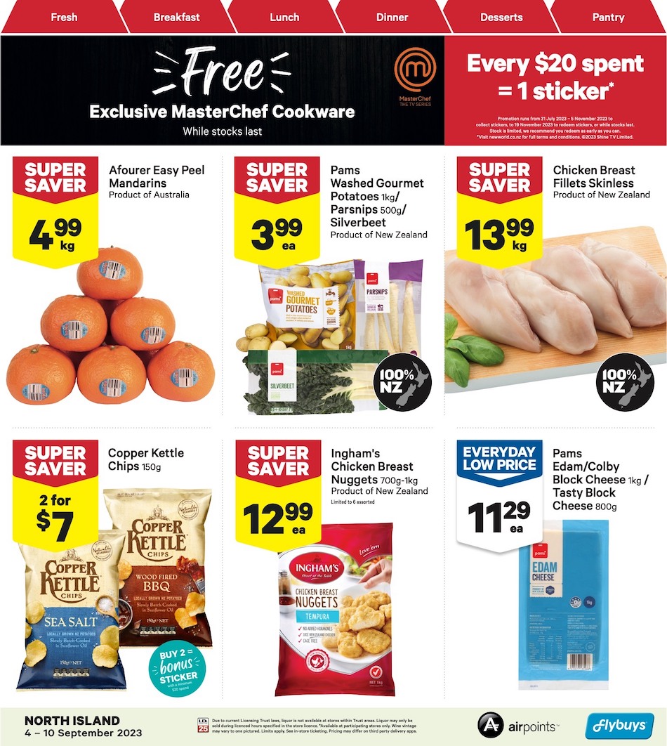 Browse the best deals in the New World Mailer. The deals that will be valid until 10th of September include super savers and everyday low prices. You can get exclusive MasterChef cookware. Every $20 spent will be equal to 1 sticker. You can find participating products of the bonus sticker sale. Toothbrush, multipurpose sprays, tuna chunk style, and more products are gonna be participating in the bonus sticker sale. Corned Beef Potato Top Pie is the recipe of the week. You can subscribe to our newsletter. We send emails to inform people about the featured catalogues of the week. Follow our social pages and you can see these deals on your feed.