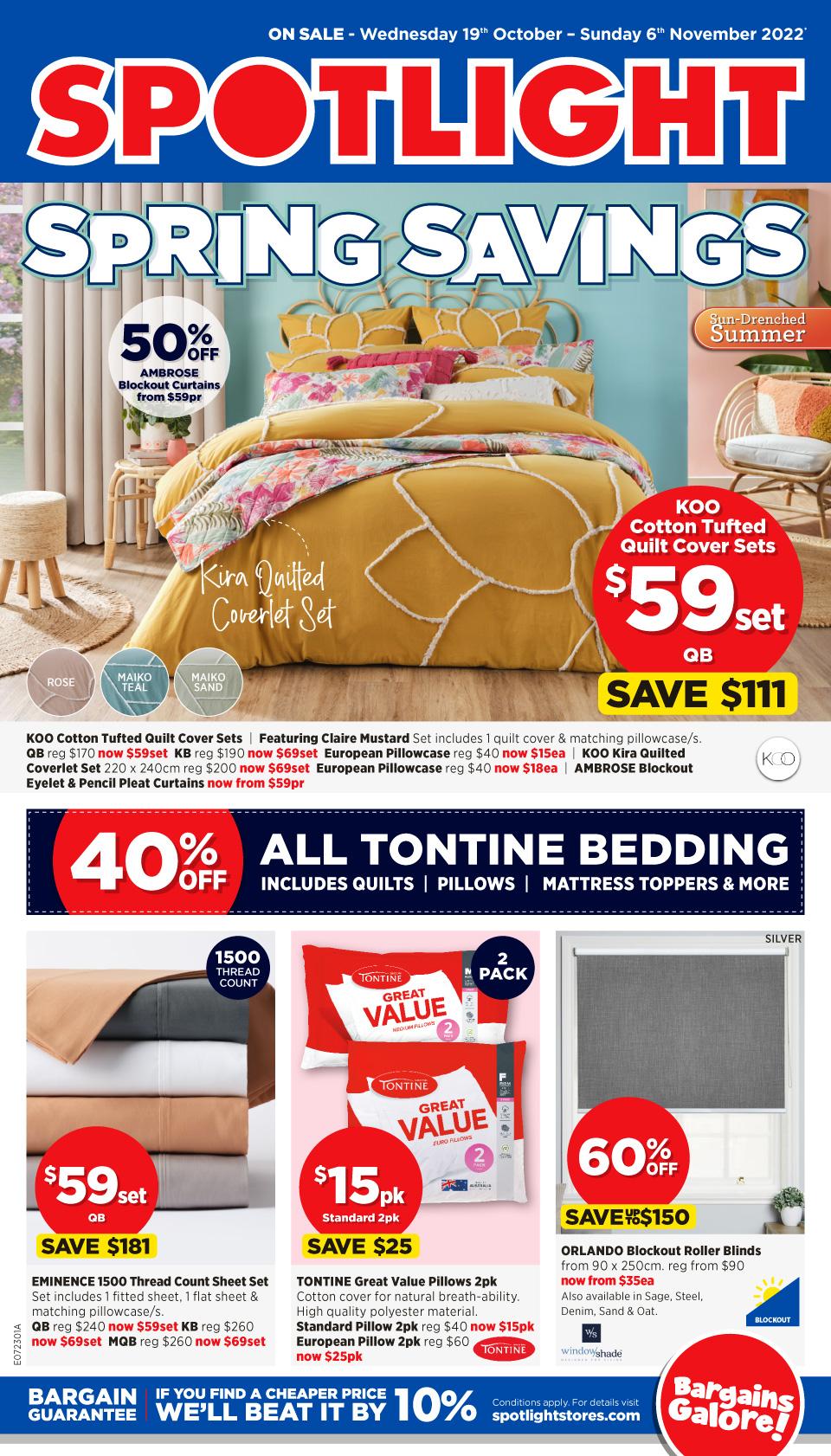Spotlight Catalogue Spring Savings are here. A new catalogue is out with half-price deals, new prices of quilt cover sets, and it contains great deals on other items you would use at home. Save 40% off all tontine bedding items. Improve the comfort your house, quality of your sleep. Spotlight Catalogue 19 Oct - 6 Nov 2022 can offer half-price sheet sets. Sheet sets, quilt cover sets, pillows, and more bedding products are gonna be cheaper. Awesome offers for your bathroom are also available in the new catalogue. Save 40% off bath mats, bathroom accessories, and bath robes.