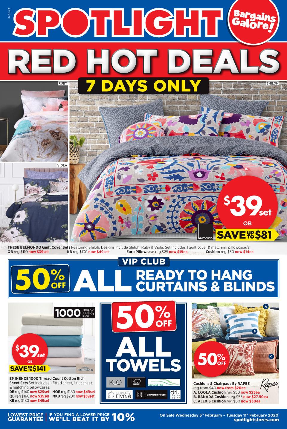 Spotlight Catalogue 5 - 11 Feb 2020 5 - 11 Feb 2020 Spotlight Catalogue « 12345 / 5 » Share & Subscribe Subscribe to Target CataloguesKmart CataloguesBig W CataloguesALDI CataloguesIGA CataloguesColes CataloguesWoolworths CataloguesAll Catalogues (40+) » Other Spotlight Catalogue Spotlight Catalogue 15 Jan - 4 Feb 2025 Spotlight Catalogue November 24 - December 3, 2024 Black Friday Spotlight Catalogue November 13 - December 1, 2024 VIP Creative Spotlight Catalogue November 12 - December 1, 2024 Make It. Gift It. Be Merry. Spotlight Catalogue October 29 - November 3, 2024 White Home Sale Other Latest Catalogue ALDI Catalogue 15 - 18 Apr 2026Amart Catalogue Jan 2025Amcal Catalogue March 11 - April 5, 2026 Hop into SavingsAnaconda Catalogue EOFY Sale 10 - 26 Jun 2025Angus and Coote Catalogue March 22 - April 12, 2026 Celebrating Love Since 1895Australia Post Catalogue Back to School Jan 2025Australian Butchers Catalogue 7 - 13 Aug 2024Autobarn Catalogue March 24 - April 14, 2026 All For Easter Holiday EssentialsBaby Bunting Catalogue May 2024BCF Catalogue April 6 - 27, 2026 ing Holiday Fun Starts HereBest & Less Catalogue Aug 2024Bob Jane Catalogue Jan 2025Cheap As Chips Catalogue December 23, 2025 - January 6, 2026 Boxing Day Door Buster DealsChemist King Catalogue 7 - 21 Aug 2024Chemist Warehouse Catalogue Jan 2025Christmas Aldi Catalogue Big Sale ClearanceColes Catalogue April 10 - 23, 2026 Best Buys - Kitchen GadgetsCostco Catalogue 9 Jun - 6 Jul 2025Discount Drug Store Catalogue Feb 2024Early Settler Cataogue EOFY 2024Ezibuy Catalogue Sale Feb 2024Foodland Catalogue 18 - 24 Feb 2026Foodworks Catalogue 11 - 17 Feb 2026Freedom Furniture Catalogue Aug 2024Goldmark Catalogue February 15 - March 22, 2026 Get the Look for LessHarris Scarfe Catalogue 24 May - 7 Jun 2025Harvey Norman Catalogue HN April Flooring Digital April 9 - 27, 2026Hop into Bunnings Catalogue March 11 - April 5, 2026 Warehouse for the Lowest PricesIGA Catalogue April 8 - 14, 2026 NSW Medium V1IKEA Catalogue Jun 2024Innovations Catalogue Summer 2024Jaycar Catalogue 7 - 20 Jan 2025JB Hi-Fi Catalogue 22 - 28 May 2025Lenovo Catalogue Jan 2024Liquorland Catalogue 7 - 13 Feb 2024Low Prices For Life - April School Holidays Kmart Catalogue April 1 - 29, 2026 Michael Hill Catalogue Unmissable Sale 2024Mitre 10 Catalogue EOFY 2024Myer Catalogue April 7 - 19, 2026 Winter Home SaleNew World Mailer 6 - 12 Apr 2026Officeworks Catalogue March 30 - April 14, 2026 We've Dropped Prices on Hundreds of School Holiday Must-HavesPriceline Catalogue Week 36-37 2025Prouds Catalogue March 22 - April 12, 2026 Sparkle and SaveRebel Sports Catalogue Jun 2024Repco Catalogue Father\'s Day 2024Sale Fantastic Furniture Catalogue December 18, 2024 - February 3, 2025 School's Out Big W Catalogue April 1, 2026 PreviewSpotlight Catalogue 15 Jan - 4 Feb 2025Stratco Catalogue Jan 2025Supercheap Auto Catalogue December 14 - 21, 2025 Make It A Super ChristmasTarget Catalogue 3 - 27 Apr 2025The Good Guys Catalogue 16 - 22 Jan 2025The Reject Shop Catalogue Jun 2024Total Tools Catalogue Father\'s Day 2024Toyworld Catalogue Toy Sale Oct - Nov 2024Weekly Woolworths Catalogue April 7 - 14, 2026 QLDWoolworths Weekly Woolworths Mailer (Countdown) March 29 - April 12, 2026 Curtain and blind sale from Spotlight Catalogue 5 - 11 Feb 2020. New deals on towels, quilts, sewing items, and many more products.
