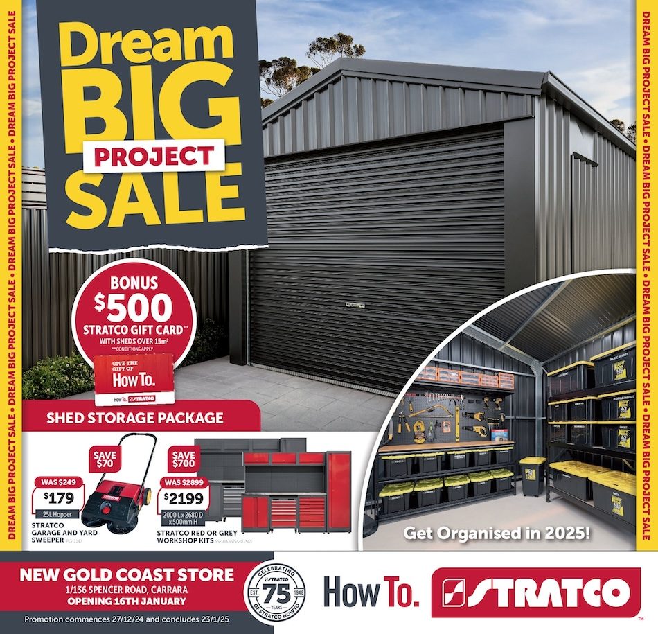 Stratco Catalogue Jan 2025 Dec 27, 2024 - Jan 24, 2025 Stratco Catalogue « 123456789101112131415161718192021 / 21 » Share & Subscribe Subscribe to Target CataloguesKmart CataloguesBig W CataloguesALDI CataloguesIGA CataloguesColes CataloguesWoolworths CataloguesAll Catalogues (40+) » Other Stratco Catalogue Stratco Catalogue Jan 2025 Stratco Catalogue 27 Sep - 31 Oct 2024 Stratco Catalogue 30 Aug - 26 Sep 2024 Stratco Catalogue Father's Day 2024 Stratco Catalogue EOFY 2024 Other Latest Catalogue ALDI Catalogue 8 - 11 Apr 2026Amart Catalogue Jan 2025Amcal Catalogue March 11 - April 5, 2026 Hop into SavingsAnaconda Catalogue EOFY Sale 10 - 26 Jun 2025Angus and Coote Catalogue March 22 - April 12, 2026 Celebrating Love Since 1895Australia Post Catalogue Back to School Jan 2025Australian Butchers Catalogue 7 - 13 Aug 2024Autobarn Catalogue March 24 - April 14, 2026 All For Easter Holiday EssentialsBaby Bunting Catalogue May 2024Best & Less Catalogue Aug 2024Bob Jane Catalogue Jan 2025Cheap As Chips Catalogue December 23, 2025 - January 6, 2026 Boxing Day Door Buster DealsChemist King Catalogue 7 - 21 Aug 2024Chemist Warehouse Catalogue Jan 2025Christmas Aldi Catalogue Big Sale ClearanceColes Catalogue April 1 - 7, 2026 WA PT HEDLANDCostco Catalogue 9 Jun - 6 Jul 2025Discount Drug Store Catalogue Feb 2024Early Settler Cataogue EOFY 2024Ezibuy Catalogue Sale Feb 2024Foodland Catalogue 18 - 24 Feb 2026Foodworks Catalogue 11 - 17 Feb 2026Freedom Furniture Catalogue Aug 2024Goldmark Catalogue February 15 - March 22, 2026 Get the Look for LessHarris Scarfe Catalogue 24 May - 7 Jun 2025Harvey Norman Catalogue Computers Amazing Tech Deals April 1 - 15, 2026Hop into Bunnings Catalogue March 11 - April 5, 2026 Warehouse for the Lowest PricesIGA Catalogue April 1 - 7, 2026 NSW Large V2IKEA Catalogue Jun 2024Innovations Catalogue Summer 2024Jaycar Catalogue 7 - 20 Jan 2025JB Hi-Fi Catalogue 22 - 28 May 2025Lenovo Catalogue Jan 2024Liquorland Catalogue 7 - 13 Feb 2024Low Prices For Life - April School Holidays Kmart Catalogue April 1 - 29, 2026 Make It A BCF Catalogue March 16 - April 6, 2026 ing Fun EasterMichael Hill Catalogue Unmissable Sale 2024Mitre 10 Catalogue EOFY 2024Myer Catalogue March 29 - April 19, 2026 Toy SaleNew World Mailer 30 Mar - 5 Apr 2026Officeworks Catalogue March 30 - April 14, 2026 We've Dropped Prices on Hundreds of School Holiday Must-HavesPriceline Catalogue Week 36-37 2025Prouds Catalogue March 22 - April 12, 2026 Sparkle and SaveRebel Sports Catalogue Jun 2024Repco Catalogue Father\'s Day 2024Sale Fantastic Furniture Catalogue December 18, 2024 - February 3, 2025 School's Out Big W Catalogue April 1, 2026 PreviewSpotlight Catalogue 15 Jan - 4 Feb 2025Stratco Catalogue Jan 2025Supercheap Auto Catalogue December 14 - 21, 2025 Make It A Super ChristmasTarget Catalogue 3 - 27 Apr 2025The Good Guys Catalogue 16 - 22 Jan 2025The Reject Shop Catalogue Jun 2024Total Tools Catalogue Father\'s Day 2024Toyworld Catalogue Toy Sale Oct - Nov 2024Weekly Woolworths Catalogue April 1 - 7, 2026 NSW NorthWoolworths Weekly Woolworths Mailer (Countdown) March 29 - April 12, 2026 Stratco Catalogue Jan 2025 with gift card deal, storage package, sheds, storage boxes, roofing, and more. 27 Dec 2024 Editor
