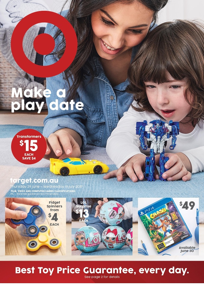 Target Catalogue 29 Jun - 19 Jul 2017 Starts 29 Jun - Ends 19 Jul Target Catalogue « 123456789101112131415161718192021222324252627282930313233343536373839404142434445464748495051525354555657 / 57 » Share & Subscribe Subscribe to Target CataloguesKmart CataloguesBig W CataloguesALDI CataloguesIGA CataloguesColes CataloguesWoolworths CataloguesAll Catalogues (40+) » Other Target Catalogue Target Catalogue 3 - 27 Apr 2025 Target Catalogue Clearance Sale Target Catalogue School Jan 2025 Target Catalogue 7 - 20 Nov 2024 Target Catalogue 19 Sep - 2 Oct 2024 Other Latest Catalogue ALDI Catalogue 29 Apr - 2 May 2026Amart Catalogue Jan 2025Amcal Catalogue April 8 - 26, 2026 Mega SaleAnaconda Catalogue EOFY Sale 10 - 26 Jun 2025Angus and Coote Catalogue April 12 - May 10, 2026 Mother's Day Gift GuideAustralia Post Catalogue Back to School Jan 2025Australian Butchers Catalogue 7 - 13 Aug 2024Autobarn Catalogue April 14 - May 5, 2026 All For The BargainsBaby Bunting Catalogue May 2024BCF Catalogue April 6 - 27, 2026 ing Holiday Fun Starts HereBest & Less Catalogue Aug 2024Bob Jane Catalogue Jan 2025Cheap As Chips Catalogue December 23, 2025 - January 6, 2026 Boxing Day Door Buster DealsChemist King Catalogue 7 - 21 Aug 2024Chemist Warehouse Catalogue Jan 2025Christmas Aldi Catalogue Big Sale ClearanceColes Catalogue April 24 - May 7, 2026 Best Buys - Better LivingCostco Catalogue 9 Jun - 6 Jul 2025Discount Drug Store Catalogue Feb 2024Early Settler Cataogue EOFY 2024Ezibuy Catalogue Sale Feb 2024Foodland Catalogue 18 - 24 Feb 2026Foodworks Catalogue 11 - 17 Feb 2026Freedom Furniture Catalogue Aug 2024Goldmark Catalogue April 12 - May 10, 2026 Gifts She'll LoveHarris Scarfe Catalogue 24 May - 7 Jun 2025Harvey Norman Catalogue Heating Made Easy April 20 - August 31, 2026Hop into Bunnings Catalogue March 11 - April 5, 2026 Warehouse for the Lowest PricesIGA Catalogue April 22 - 28, 2026 QLD Large V2IKEA Catalogue Jun 2024Innovations Catalogue Summer 2024Jaycar Catalogue 7 - 20 Jan 2025JB Hi-Fi Catalogue 22 - 28 May 2025Lenovo Catalogue Jan 2024Liquorland Catalogue 7 - 13 Feb 2024Michael Hill Catalogue Unmissable Sale 2024Mitre 10 Catalogue EOFY 2024Mother's Day Kmart Catalogue April 15 - May 10, 2026 Mum, Sorted Big W Catalogue April 15, 2026 PreviewMyer Catalogue April 19 - May 10, 2026 Mothers Love Turning HeadsNew World Mailer 13 - 19 Apr 2026Officeworks Catalogue March 30 - April 14, 2026 We've Dropped Prices on Hundreds of School Holiday Must-HavesPriceline Catalogue March 31 - May 30, 2026 Health & BeautyProuds Catalogue April 12 - May 10, 2026 Celebrate and SaveRebel Sports Catalogue Jun 2024Repco Catalogue Father\'s Day 2024Sale Fantastic Furniture Catalogue December 18, 2024 - February 3, 2025 Spotlight Catalogue 15 Jan - 4 Feb 2025Stratco Catalogue Jan 2025Supercheap Auto Catalogue December 14 - 21, 2025 Make It A Super ChristmasTarget Catalogue 3 - 27 Apr 2025The Good Guys Catalogue 16 - 22 Jan 2025The Reject Shop Catalogue Jun 2024Total Tools Catalogue Father\'s Day 2024Toyworld Catalogue Toy Sale Oct - Nov 2024Weekly Woolworths Catalogue April 22 - 28, 2026 VICWoolworths Weekly Woolworths Mailer (Countdown) April 19 - 26, 2026 This Target Catalogue 29 Jun - 19 Jul 2017 has a toy sale range for your whole family. Check out all products.1