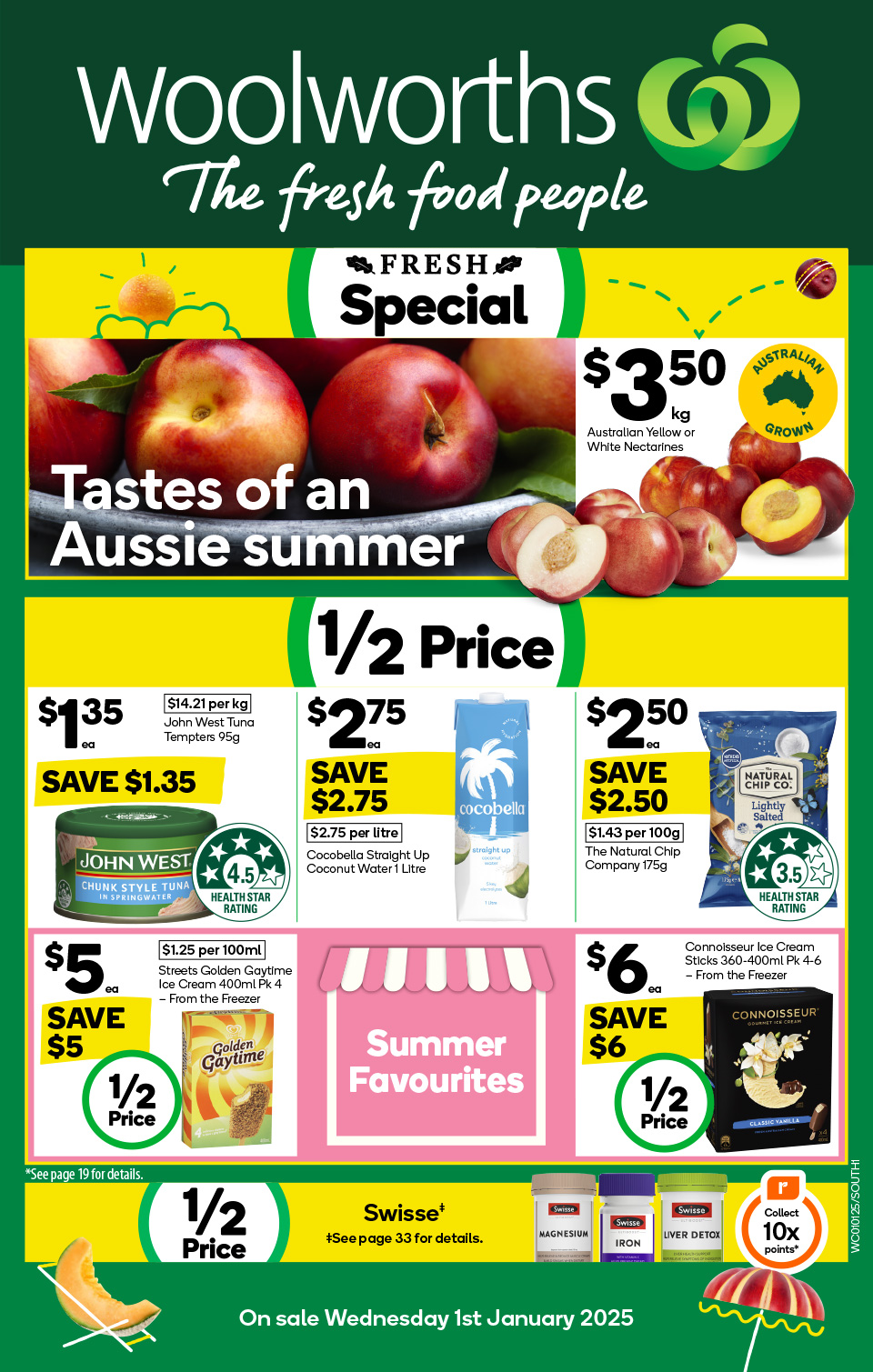 Weekly Specials Woolworths Catalogue January 1 - 7, 2025 NSW South Jan 1, 2025 - Jan 8, 2025 Woolworths Catalogue « 1234567891011121314151617181920212223242526272829303132333435363738394041424344454647 / 47 » Share & Subscribe Subscribe to Target CataloguesKmart CataloguesBig W CataloguesALDI CataloguesIGA CataloguesColes CataloguesWoolworths CataloguesAll Catalogues (40+) » Other Woolworths Catalogue Weekly Woolworths Catalogue April 1 - 7, 2026 NSW North Weekly Woolworths Catalogue April 1 - 7, 2026 QLD Weekly Woolworths Catalogue April 1 - 7, 2026 NSW South Weekly Woolworths Catalogue April 1 - 7, 2026 VIC Weekly Woolworths Catalogue April 1 - 7, 2026 PORT HEDLAND Other Latest Catalogue ALDI Catalogue 1 - 4 Apr 2026Amart Catalogue Jan 2025Amcal Catalogue March 11 - April 5, 2026 Hop into SavingsAnaconda Catalogue EOFY Sale 10 - 26 Jun 2025Angus and Coote Catalogue March 22 - April 12, 2026 Celebrating Love Since 1895Australia Post Catalogue Back to School Jan 2025Australian Butchers Catalogue 7 - 13 Aug 2024Autobarn Catalogue March 24 - April 14, 2026 All For Easter Holiday EssentialsBaby Bunting Catalogue May 2024Best & Less Catalogue Aug 2024Bob Jane Catalogue Jan 2025Cheap As Chips Catalogue December 23, 2025 - January 6, 2026 Boxing Day Door Buster DealsChemist King Catalogue 7 - 21 Aug 2024Chemist Warehouse Catalogue Jan 2025Christmas Aldi Catalogue Big Sale ClearanceColes Catalogue April 1 - 7, 2026 WA PT HEDLANDCostco Catalogue 9 Jun - 6 Jul 2025Discount Drug Store Catalogue Feb 2024Early Settler Cataogue EOFY 2024Ezibuy Catalogue Sale Feb 2024Foodland Catalogue 18 - 24 Feb 2026Foodworks Catalogue 11 - 17 Feb 2026Freedom Furniture Catalogue Aug 2024Goldmark Catalogue February 15 - March 22, 2026 Get the Look for LessHarris Scarfe Catalogue 24 May - 7 Jun 2025Harvey Norman Catalogue LG + GWS March 25 - September 4, 2026Hop into Bunnings Catalogue March 11 - April 5, 2026 Warehouse for the Lowest PricesIGA Catalogue April 1 - 7, 2026 NSW Large V2IKEA Catalogue Jun 2024Innovations Catalogue Summer 2024Jaycar Catalogue 7 - 20 Jan 2025JB Hi-Fi Catalogue 22 - 28 May 2025Lenovo Catalogue Jan 2024Liquorland Catalogue 7 - 13 Feb 2024Low Prices for Life - Easter Kmart Catalogue March 4 - April 4, 2026 Make It A BCF Catalogue March 16 - April 6, 2026 ing Fun EasterMichael Hill Catalogue Unmissable Sale 2024Mitre 10 Catalogue EOFY 2024Myer Catalogue March 29 - April 19, 2026 Toy SaleNew World Mailer 30 Mar - 5 Apr 2026Officeworks Catalogue March 30 - April 14, 2026 We've Dropped Prices on Hundreds of School Holiday Must-HavesPriceline Catalogue Week 36-37 2025Prouds Catalogue March 22 - April 12, 2026 Sparkle and SaveRebel Sports Catalogue Jun 2024Repco Catalogue Father\'s Day 2024Sale Fantastic Furniture Catalogue December 18, 2024 - February 3, 2025 School's Out Big W Catalogue April 1, 2026 PreviewSpotlight Catalogue 15 Jan - 4 Feb 2025Stratco Catalogue Jan 2025Supercheap Auto Catalogue December 14 - 21, 2025 Make It A Super ChristmasTarget Catalogue 3 - 27 Apr 2025The Good Guys Catalogue 16 - 22 Jan 2025The Reject Shop Catalogue Jun 2024Total Tools Catalogue Father\'s Day 2024Toyworld Catalogue Toy Sale Oct - Nov 2024Weekly Woolworths Catalogue April 1 - 7, 2026 NSW NorthWoolworths Weekly Woolworths Mailer (Countdown) March 29 - April 12, 2026 Experience big savings in the Woolworths Catalogue starting January 1, 2025! Quality products at reduced prices. 1 Jan 2025 Editor